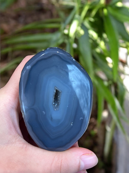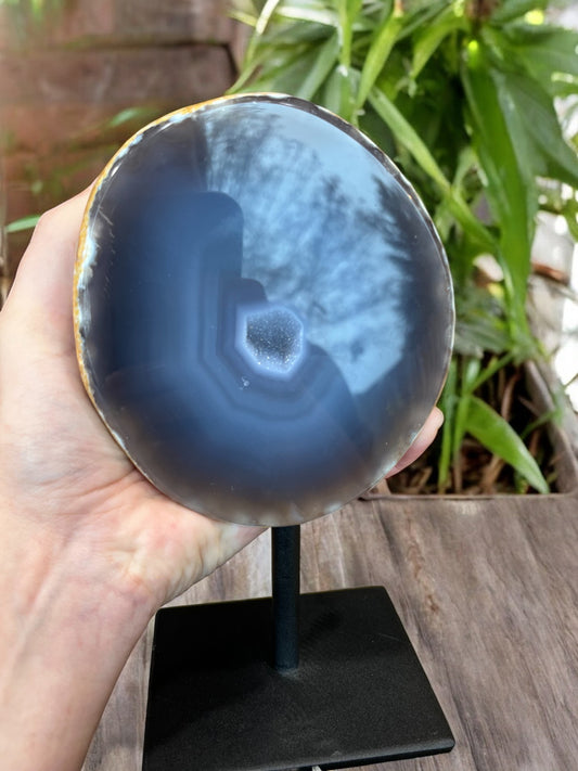 Donkerblauwe Agaat Drusy Kristallen op Standaard - Balans, Stabiliteit en Sereniteit